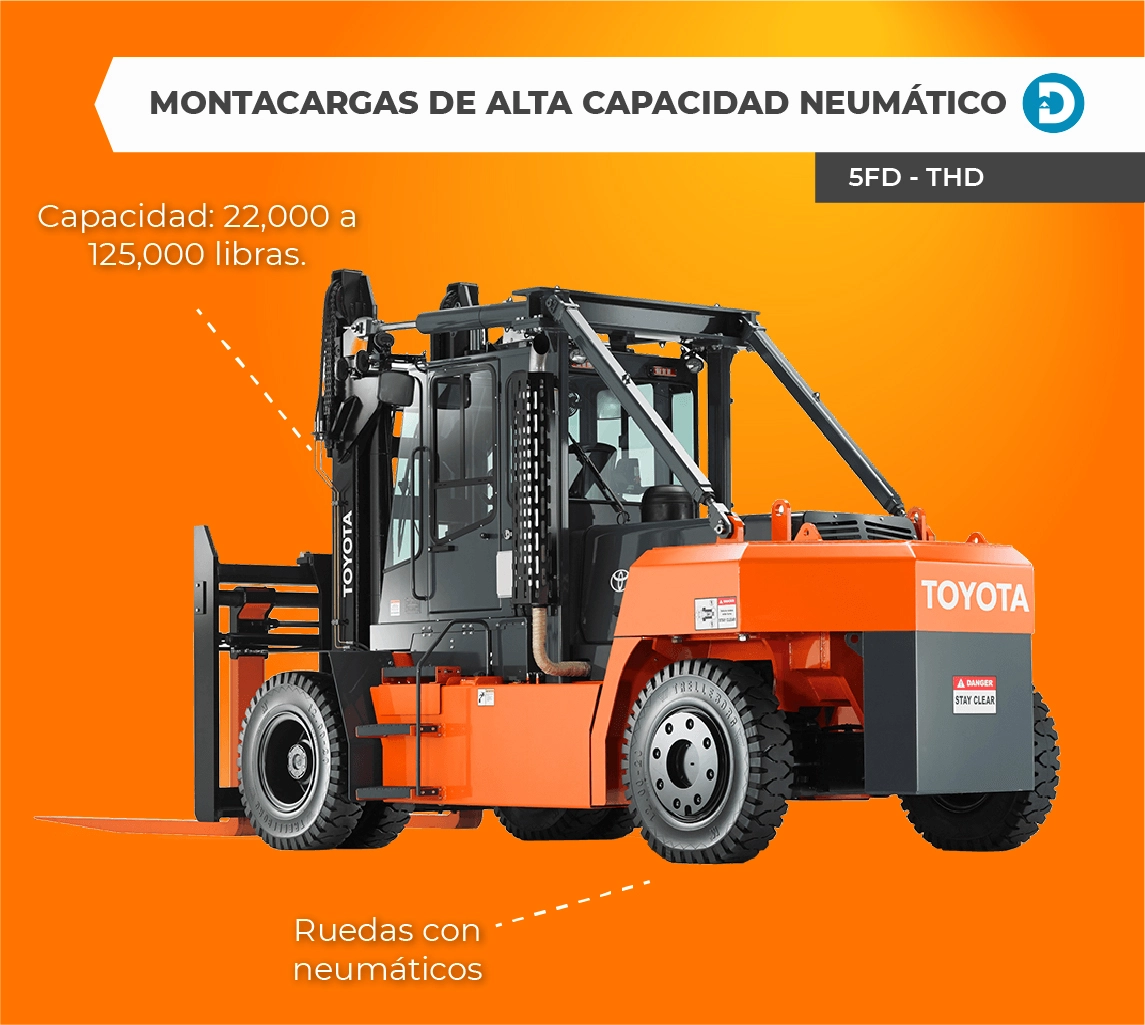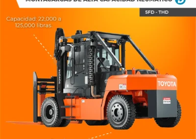 Por otro lado, los modelos de alta capacidad neumático (5FD – THD) de Toyota tienen una capacidad de elevación de 22,000 a 125,000 libras y una velocidad de desplazamiento de 9.9 a 18 MPH a carga completa. Disponibles en tres modelos diferentes, estos montacargas neumáticos son el más grande en la línea de productos de Toyota y están diseñados para ser duraderos y eficientes en todas las condiciones. Funcionan con motor diésel certificado EPA / CARB y tienen una cabina de operador cerrada, así como un sistema de control del motor.