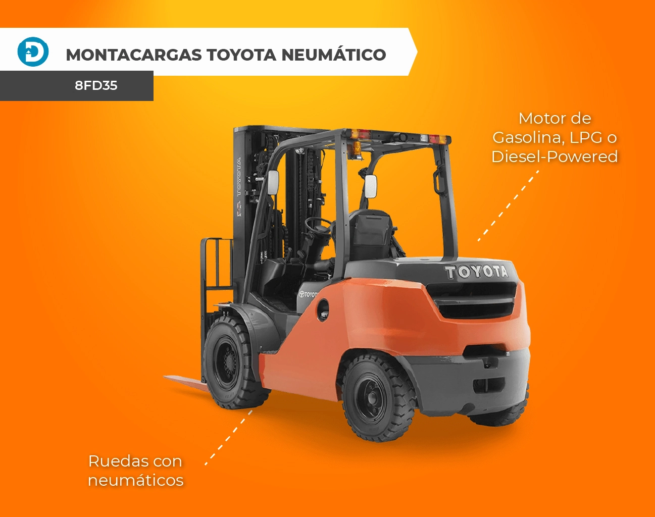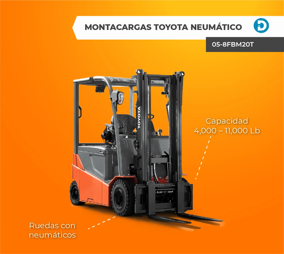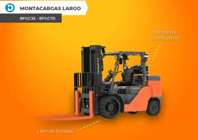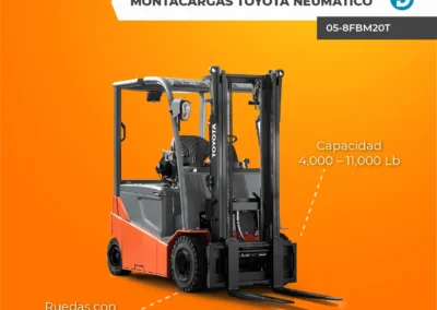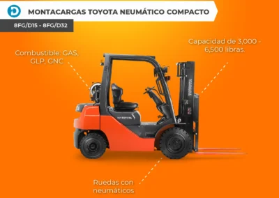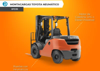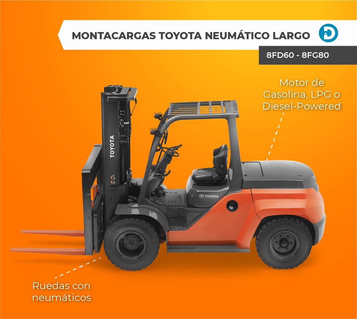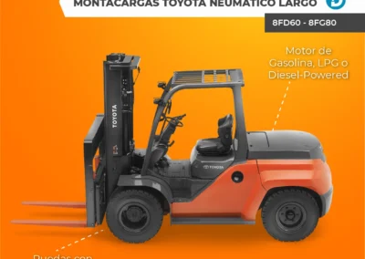 Algunos modelos de montacargas Toyota con llantas de neumático y combustión interna incluyen los modelos 8FD60 – 8FG80 y 8FD35 – 8FG50.