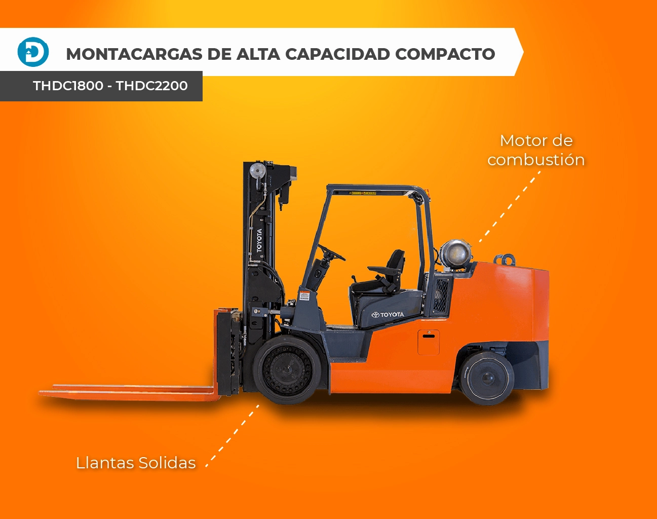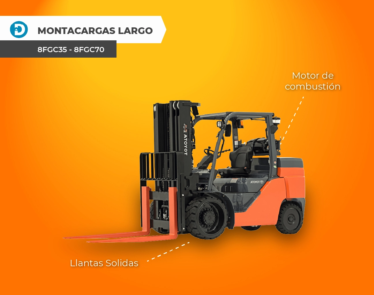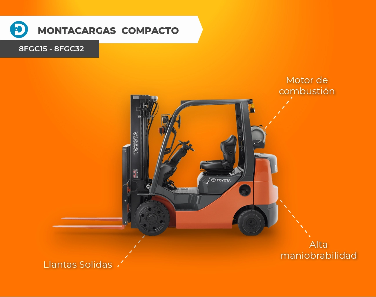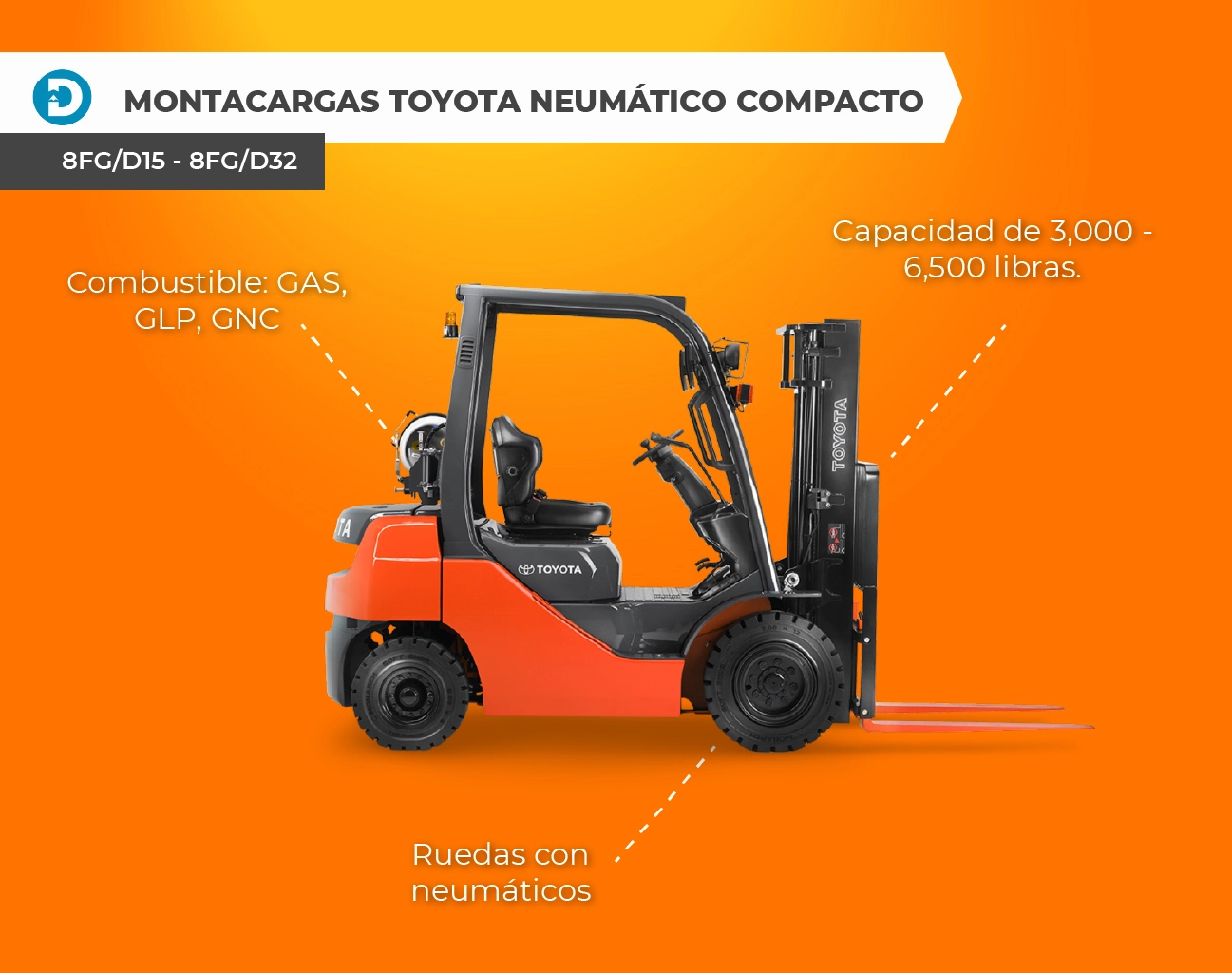 Algunos modelos de montacargas Toyota con llantas de neumático y combustión interna incluyen los modelos 8FD60 – 8FG80 y 8FD35 – 8FG50.
