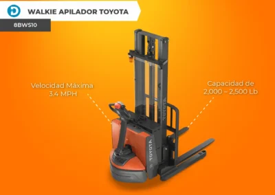 En la marca de montacargas Toyota, se pueden encontrar diferentes tipos de pallet jacks eléctricos, como el Walkie Apilador 8BWS10-8BWS13, que tiene una capacidad de elevación de 2,000-2,500 libras, mejoras en la batería, es AC-Powered y tiene un voltaje de 24. También cuenta con una velocidad máxima de desplazamiento de 3.4 MPH.