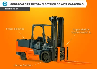 Toyota Montacargas de Alta Capacidad Cushion (THDC2500-24 – THDC5500-36) es un verdadero mamut de interior con capacidades de elevación de 25,000 a 100,000 libras. Este modelo cuenta con un sistema de enfriamiento de alta capacidad, motor 5.7 L V8 y es ideal para entornos automotrices y plantas de fabricación de acero móviles en movimiento.