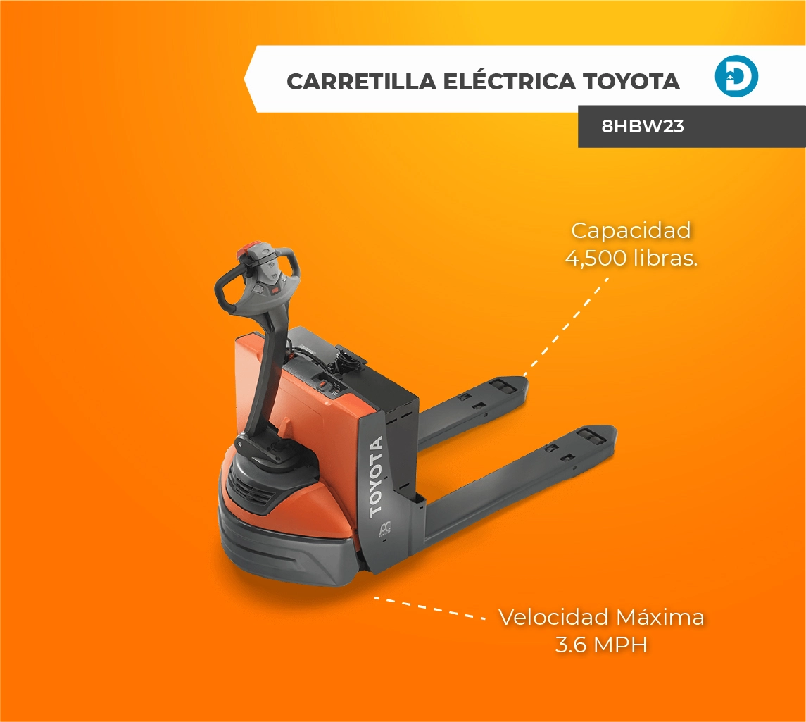 La Carretilla Eléctrica (8HBW23) es otro modelo de montacargas Toyota, con una capacidad de carga de 4,500 libras, sistema eléctrico con clasificación IP65, velocidad de desplazamiento de 3.6 MPH a velocidad completa y un sistema eléctrico de 24 voltios. Cuenta con un motor de accionamiento de CA para mayor eficiencia.