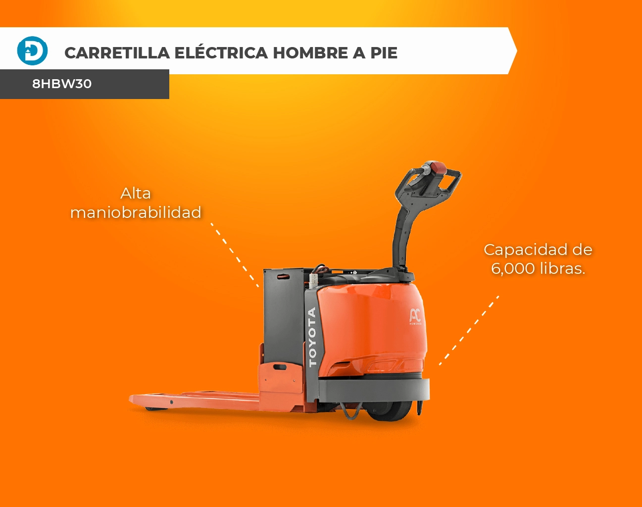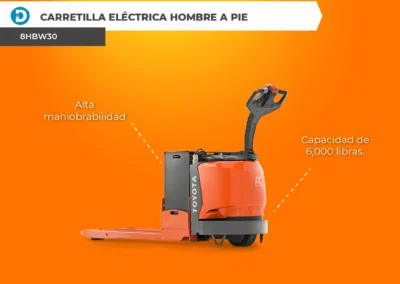 La Carretilla Eléctrica «walkie» / A Pie (8HBW30) es una excelente opción para maniobrar cargas pesadas en todo el almacén de manera eficiente, práctica y productiva. Tiene una capacidad de carga de 6,000 libras, frenado regenerativo, es AC-Powered y tiene una velocidad de viaje de 3.7 MPH.
