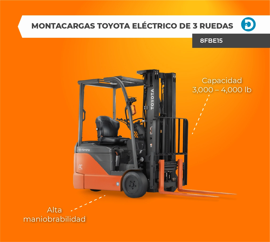 Algunos modelos de montacargas eléctricos de Toyota incluyen el montacargas eléctrico compacto, el montacargas eléctrico largo y el montacargas eléctrico de tres ruedas.