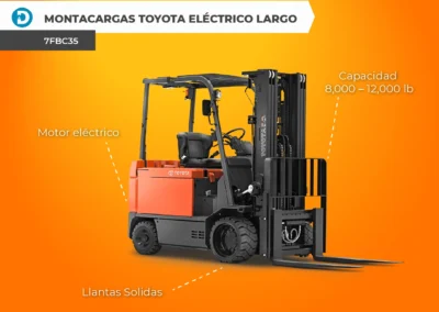 Si necesitas una mayor capacidad de elevación, el montacargas eléctrico largo de Toyota (7FBC35-7FBC55) puede ser una excelente opción. Con una capacidad de elevación de 8,000 a 12,000 libras, este modelo cuenta con un Sistema de Estabilidad Activa (SAS) y funciona sin humos, lo que significa costos de mantenimiento limitados. Con una velocidad de viaje de 7.5 a 10.9 MPH con carga completa, este modelo es una excelente solución para grandes cargas.