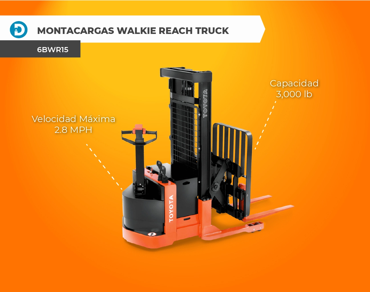 Por otro lado, el montacargas walkie reach truck (6BWR15) tiene una capacidad de carga de 3,000 libras y está aprobado por UL-E. Su velocidad de desplazamiento es de 2.8 MPH y cuenta con un sistema de accionamiento programable. Este Reach Truck eléctrico de Toyota es extremadamente versátil y ayuda a disminuir la fatiga y el tiempo de inactividad del operador al hacer que los productos se muevan a través del almacén de manera rápida y eficiente.