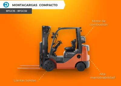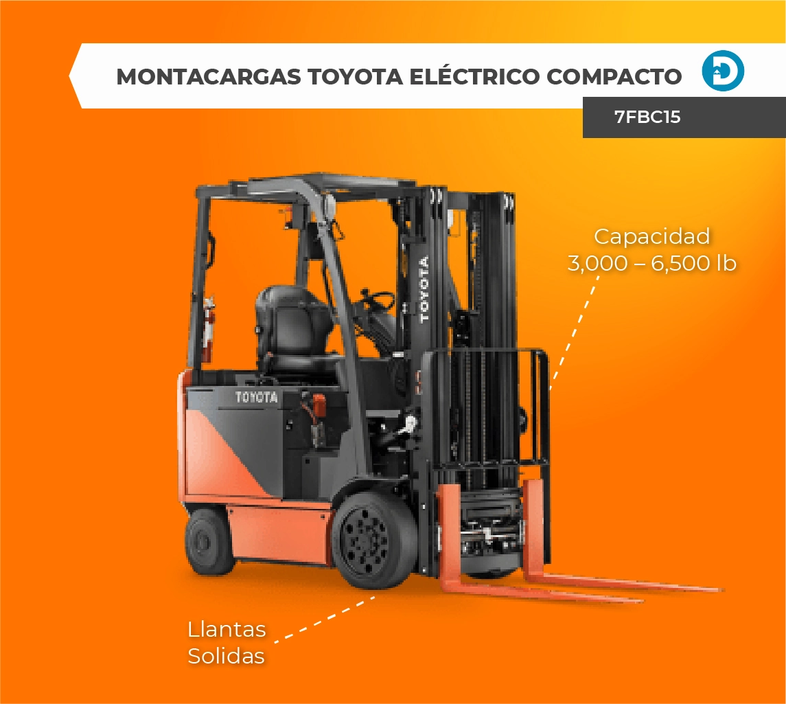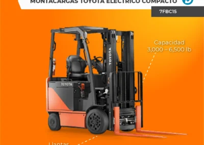 Uno de los modelos más compactos es el montacargas eléctrico (7FBC15-8FBC32) posee con una capacidad de elevación de 3,000 a 6,500 libras. Este modelo cuenta con un Sistema de Elevación Activa (SAS) y puede operar en espacios tan pequeños como 11 pies de ancho. Además, cuenta con velocidades de viaje un 21% más rápidas que otros modelos similares, alcanzando una velocidad de desplazamiento de 9 a 11.5 MPH con carga completa.
