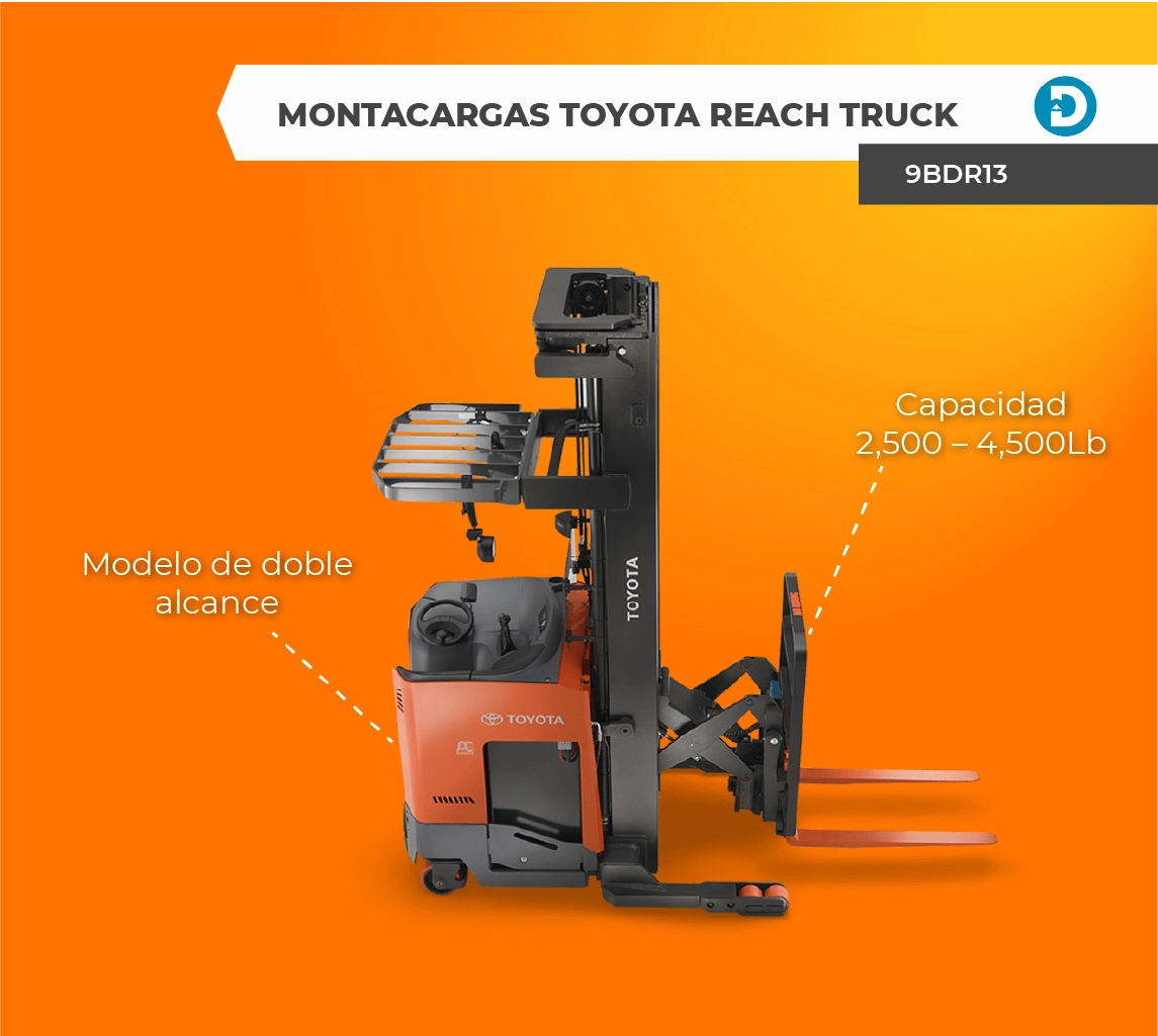 En cuanto a los modelos, el montacargas reach truck (9BDR13 – 9BR23) tiene una capacidad de carga de 2,500 – 4,500 libras y viene en un modelo de alcance único o doble alcance. Además, tiene un aumento del 50% en los intervalos de mantenimiento y una caja de batería de 18.5 pulgadas para una mayor versatilidad. La velocidad de desplazamiento con carga completa es de 6.5 a 7.5 MPH. Los Reach Trucks eléctricos de Toyota ofrecen eficiencia, seguridad y rendimiento como nunca antes, con una altura máxima de las horquillas de hasta 30.5 pies.