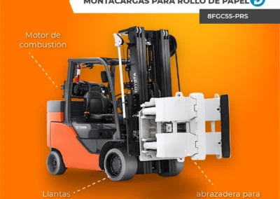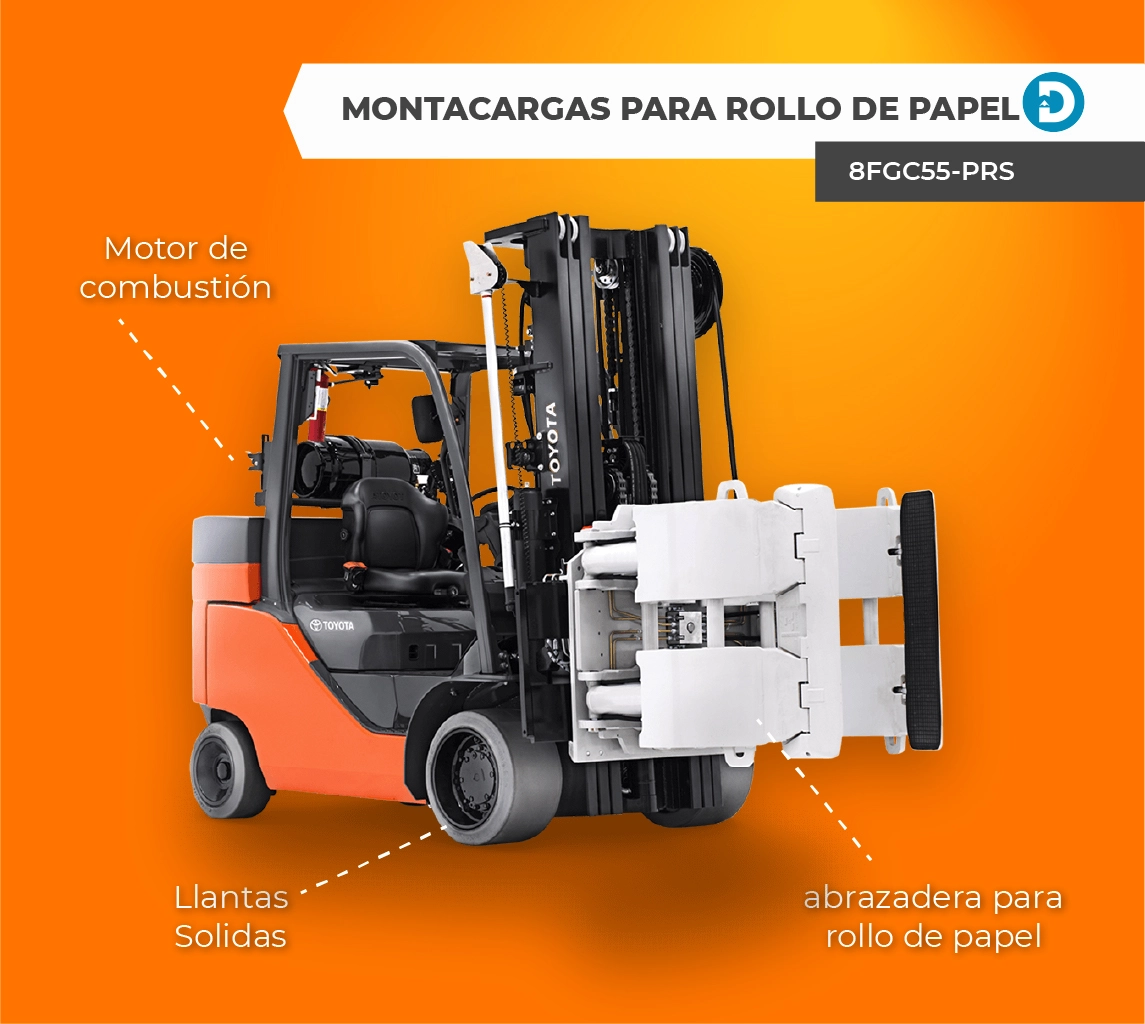 Dentro de Toyota montacargas también se encuentra el montacargas especial para rollo de papel 8FGC55-PRS, que tiene una capacidad de elevación de 12,000 lb, sistema de estabilidad activa (SAS), nivelación automática de la abrazadera, apiladora de hasta 3 rollos de alto, sistema de monitoreo integrado y sistema de enclavamiento de liberación de abrazadera. Este modelo es alimentado por gas o LPG y es ideal para el manejo de rollos de papel.