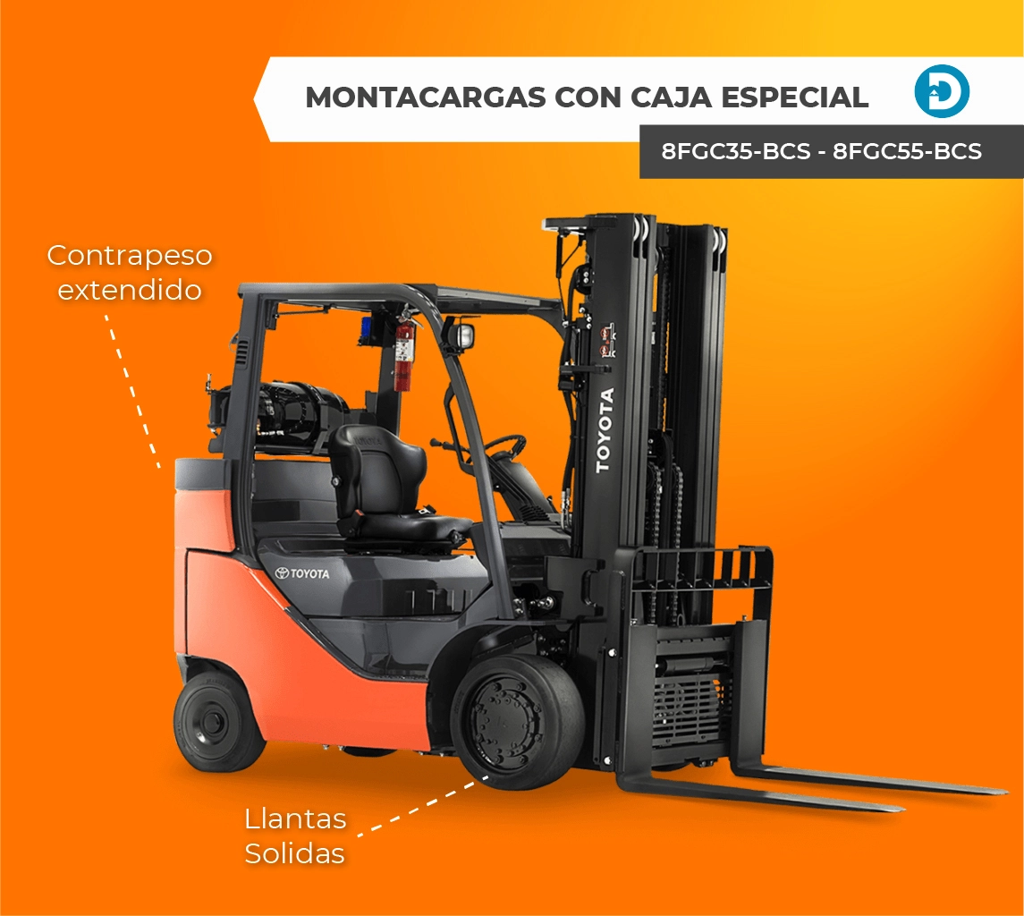 El Montacargas con Caja Especial (8FGC35-BCS – 8FGC55-BCS) es capaz de navegar en espacios reducidos gracias a su radio de giro más cerrado. Con una capacidad de elevación de 8,000 a 12,000 libras, es un 20% más eficiente en combustible y cuenta con un controlador de función de mástil activo y un contrapeso verticalmente más alto.