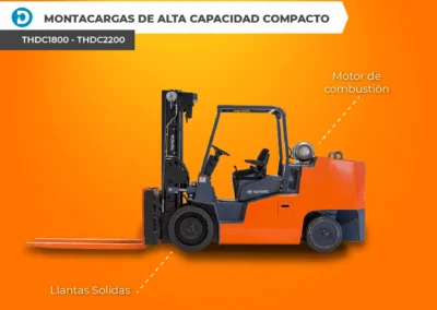 El Montacargas Cushion de Alta Capacidad Compacto (THDC1800 – THDC2200) cuenta con una capacidad de elevación de 18,000 a 22,000 libras y ofrece cuatro modelos diferentes para elegir. Con un sistema eléctrico de 12 voltios, transmisión de cambio de Dana de 3 velocidades, motor 4.3 L V6 y sistema de apagado del motor, este modelo es ideal para aplicaciones de alta capacidad.